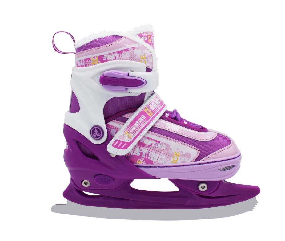 Яркие надежные коньки с раздвижным механизмом от бренда RGX прекрасно подходят для катания как по искусственному, так и по натуральному льду. Специальная раздвижная конструкция с кнопочным фиксатором избавляет от необходимости менять коньки каждый сезон, а также позволяет использовать одну пару коньков разным людям. Раздвижной механизм позволяет настраивать коньки на 4 размера. Внешний ботинок выполнен из ударопрочного и морозостойкого пластика, отлично выдерживает высокие нагрузки. Внутренний ботинок анатомической формы с мягкой стелькой из пеноматериала обеспечивает комфорт во время катания. Утепленная искусственным мехом подкладка гарантирует длительное сохранение тепла. Коньки имеют удобную систему фиксации на ноге со шнуровкой, клипсой с фиксатором и застежкой на липучке. Прочное фигурное лезвие выполнено из нержавеющего стального сплава, который отличается высокой износостойкостью и надежностью. Привлекательный дизайн с яркой расцветкой в фиолетовых тонах особенно порадует девушек.В комплектацию входит сумка для удобства переноски и хранения коньков.